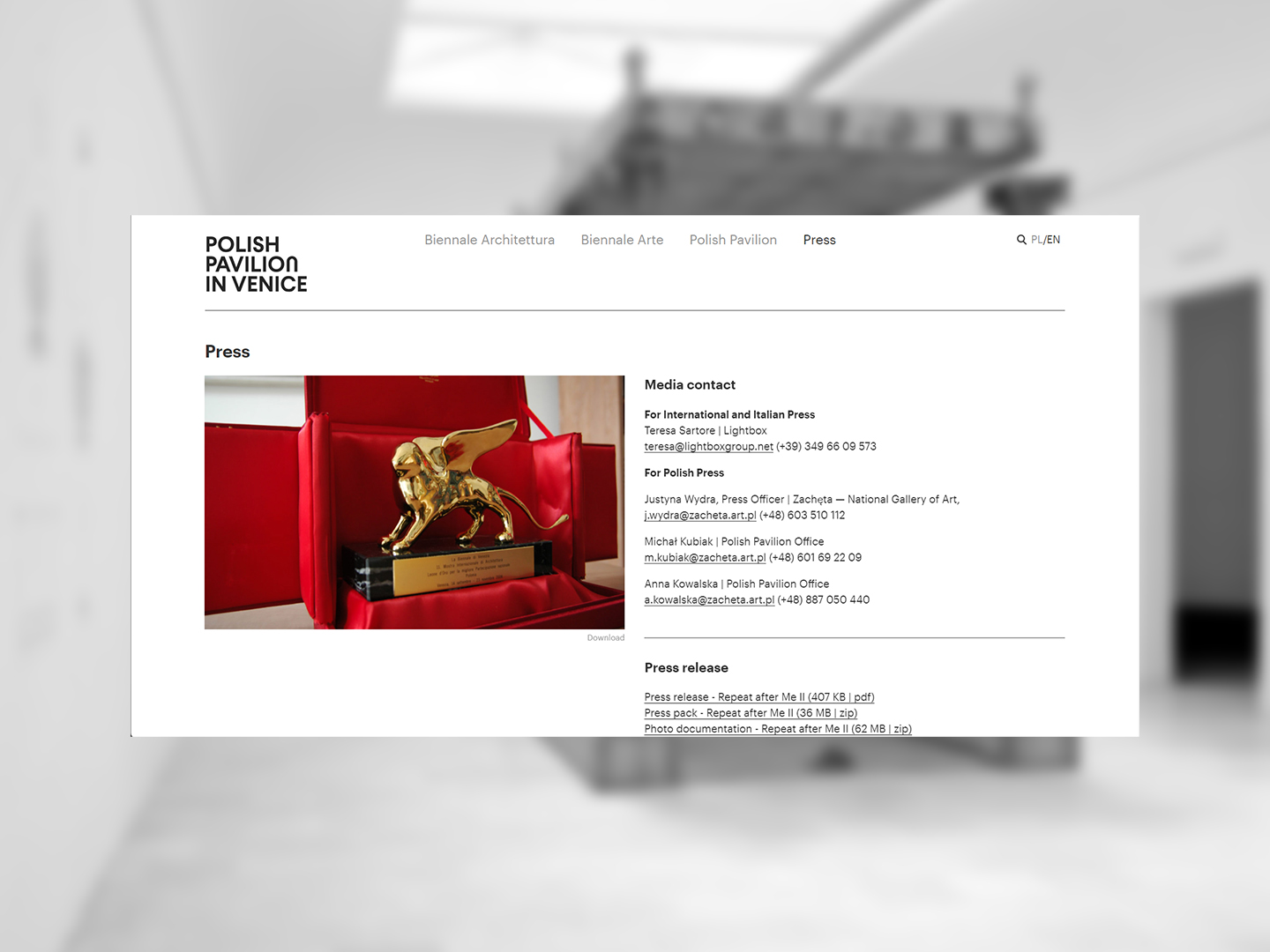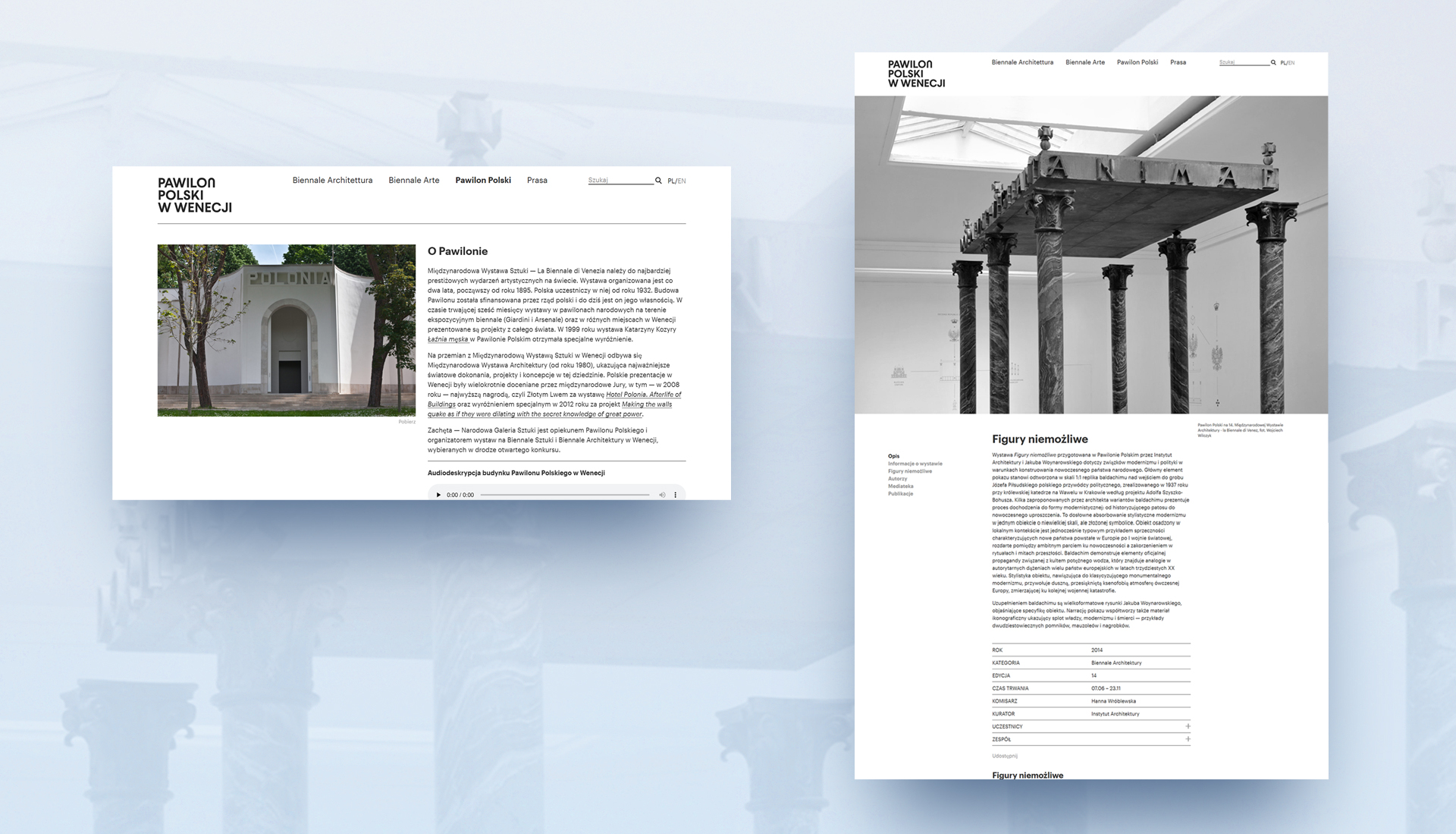 We proposed a flexible digital system designed to endure. Our work included the website’s design and development, the creation of a new logo for the Polish Pavilion, and later also the design of print materials. The platform was structured to accommodate successive Biennale editions while maintaining clarity and consistency. Particular attention was given to condensing key exhibition information into a clear and legible format, supported by modern typography and a restrained visual language that allows the content to remain central.